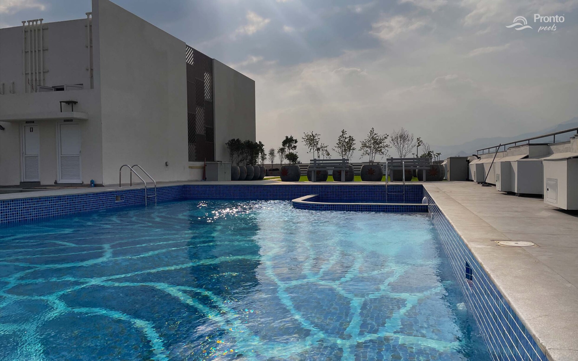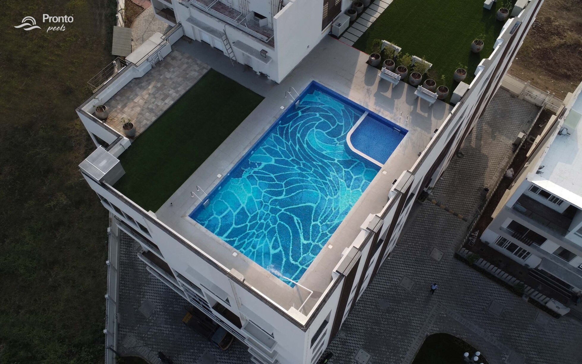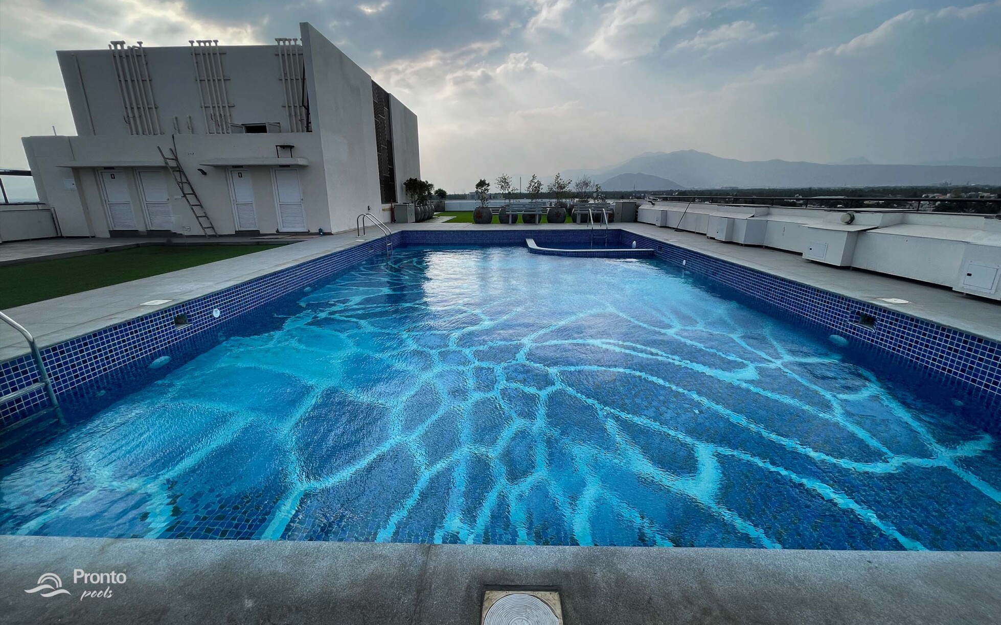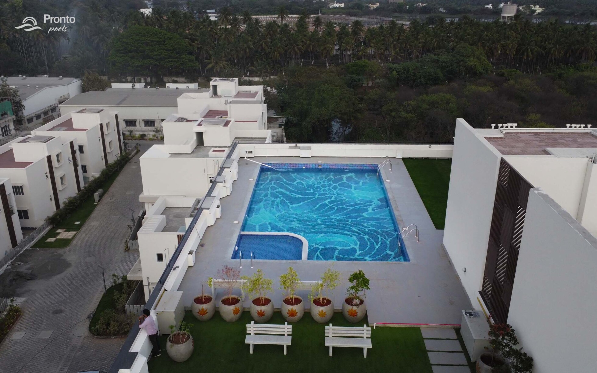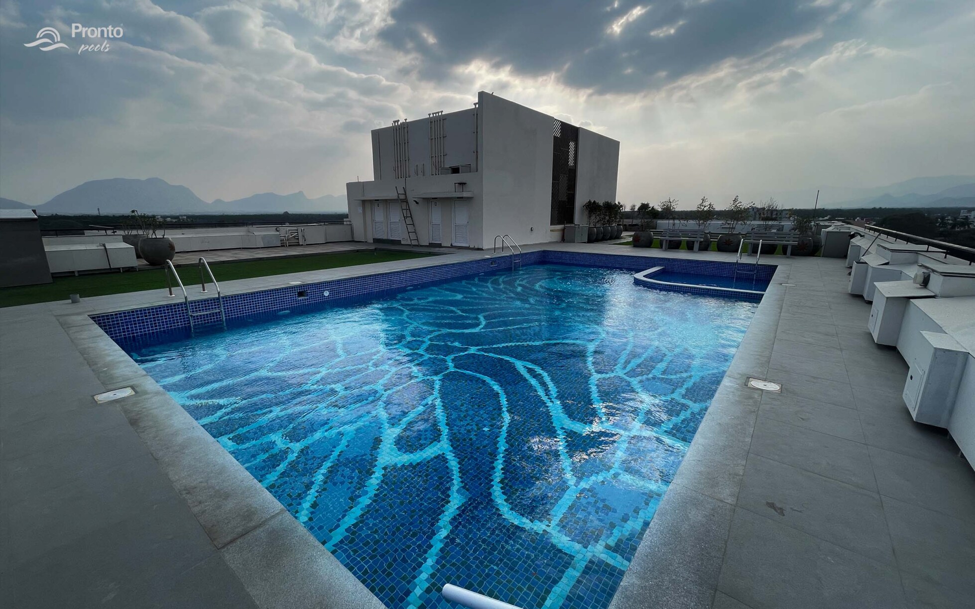 Perched on the rooftop of an exclusive clubhouse, the Mayflower Royal Woods pool is a masterpiece of design. Located within a prestigious gated community featuring luxury apartments and individual villas, this pool offers an unparalleled experience with breathtaking views. Designed with precision, the pool features an intricately laid tile design, adding elegance and uniqueness to the space. Positioned on the banks of Narasampatti Lake, it provides a serene and picturesque backdrop, creating a seamless connection between water and nature.