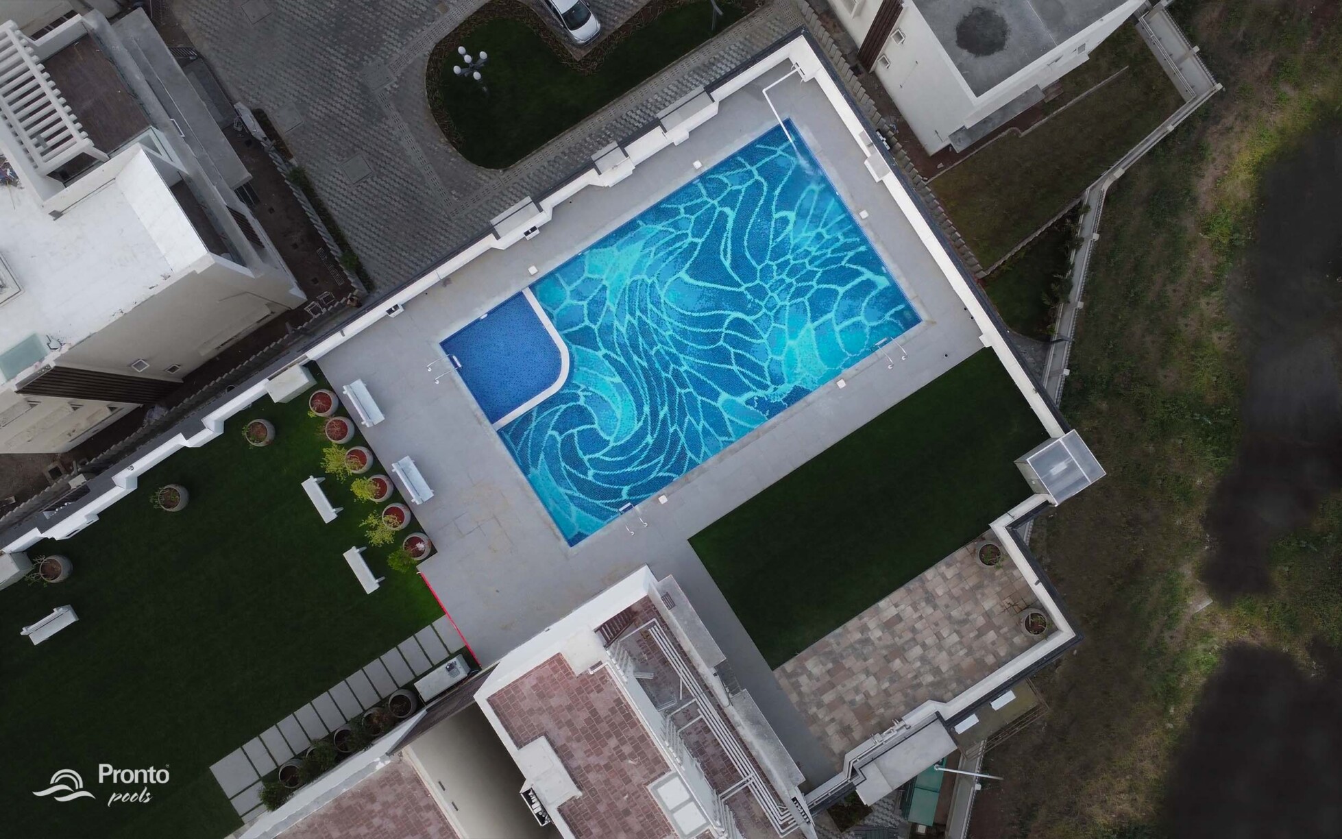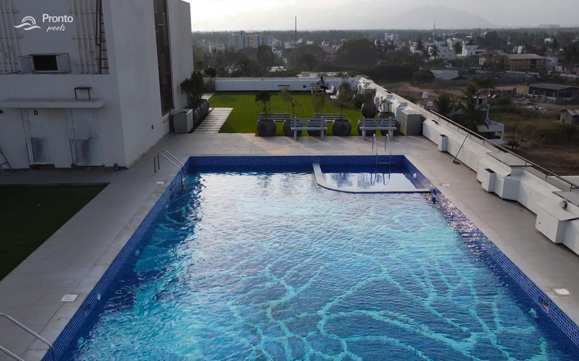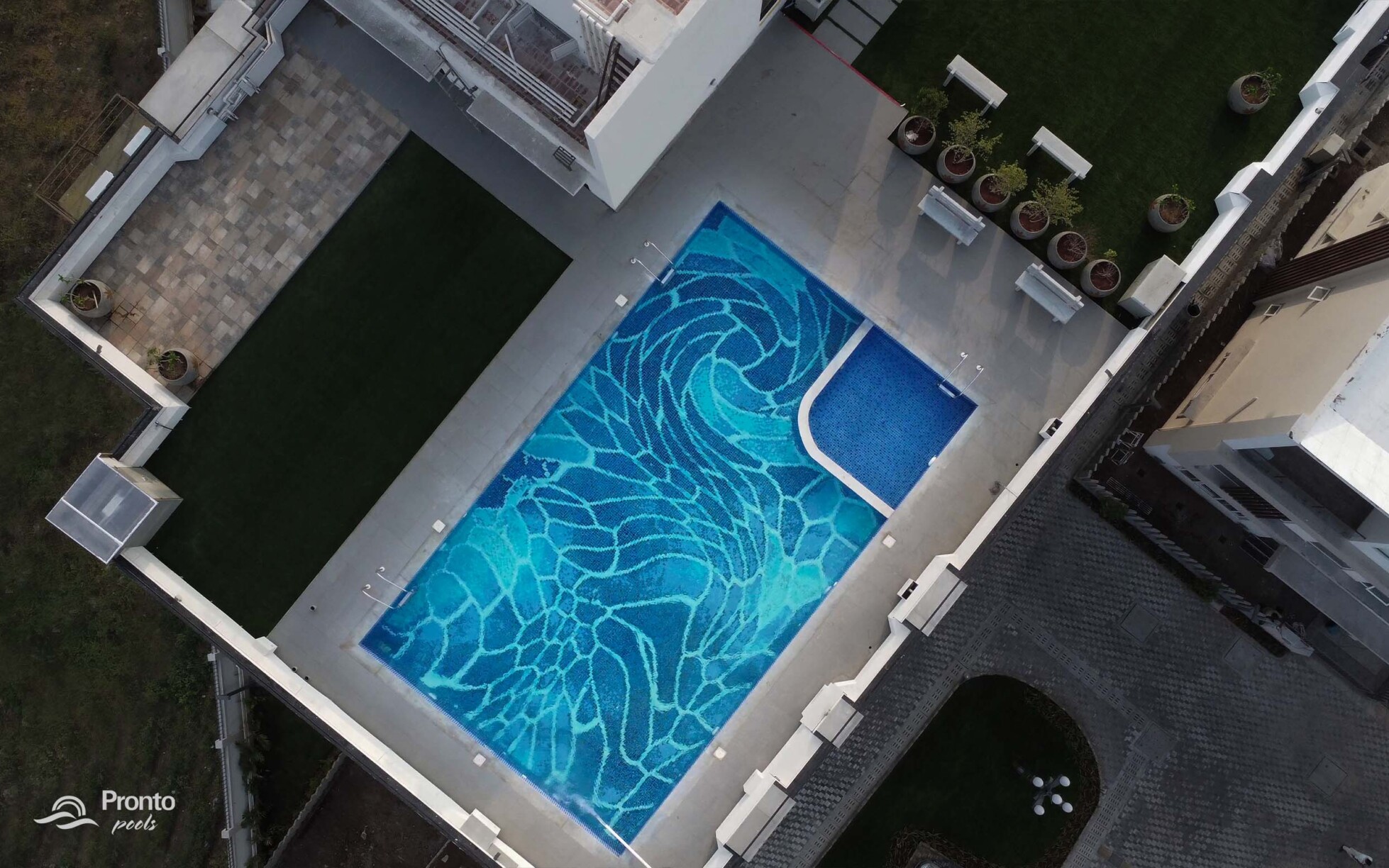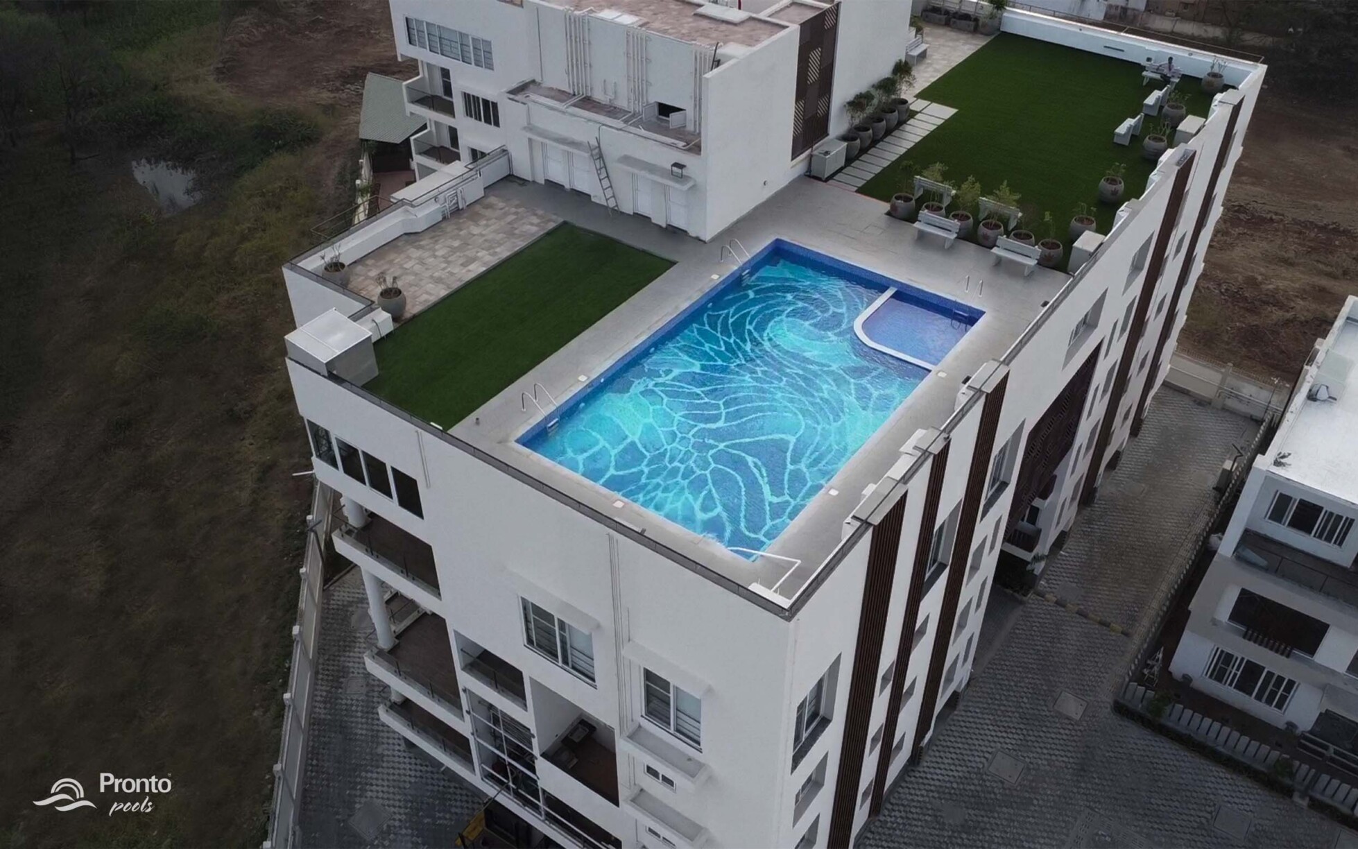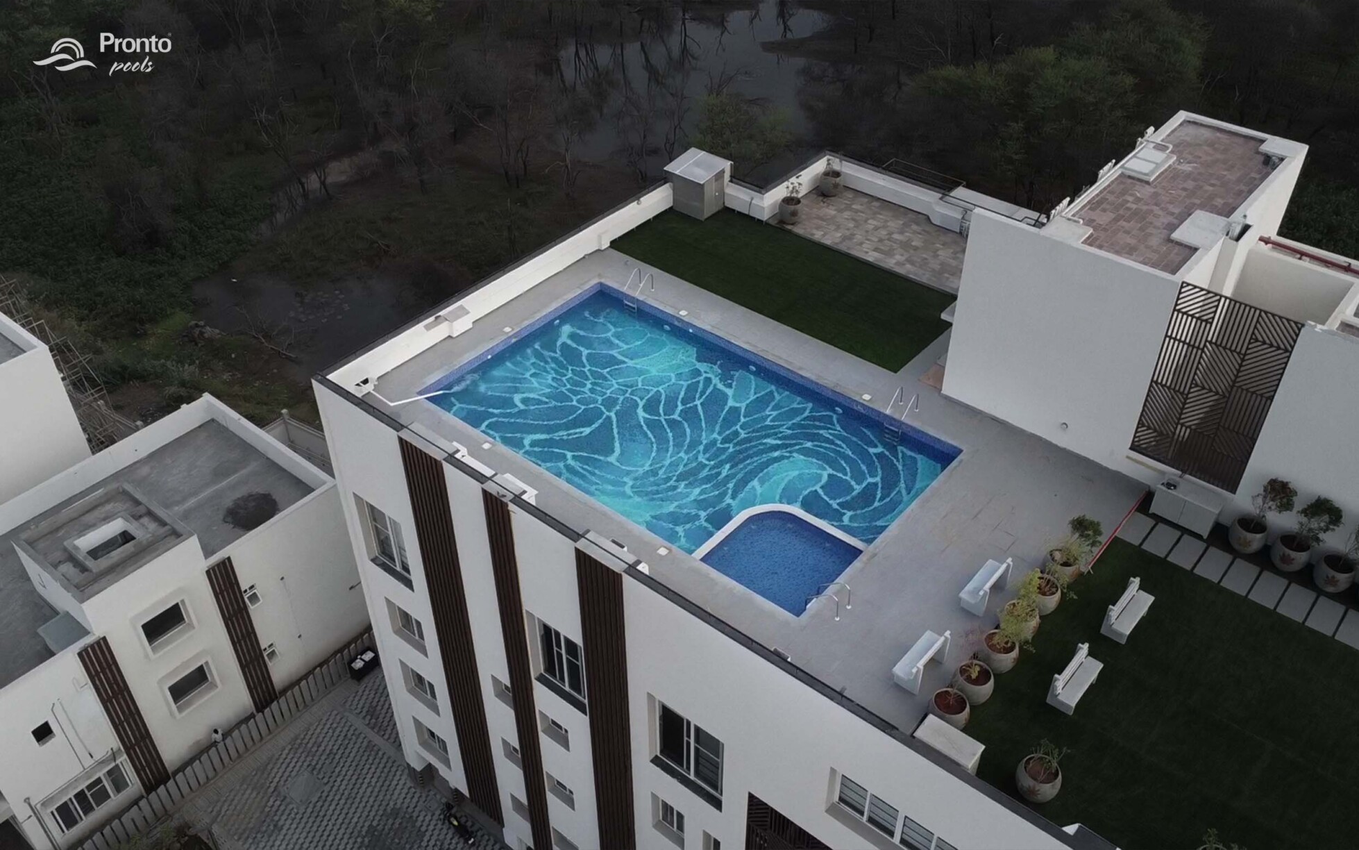 Perched on the rooftop of an exclusive clubhouse, the Mayflower Royal Woods pool is a masterpiece of design. Located within a prestigious gated community featuring luxury apartments and individual villas, this pool offers an unparalleled experience with breathtaking views. Designed with precision, the pool features an intricately laid tile design, adding elegance and uniqueness to the space. Positioned on the banks of Narasampatti Lake, it provides a serene and picturesque backdrop, creating a seamless connection between water and nature.