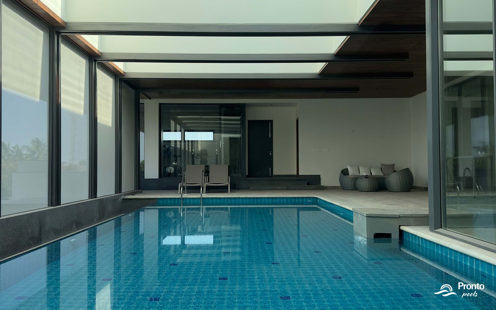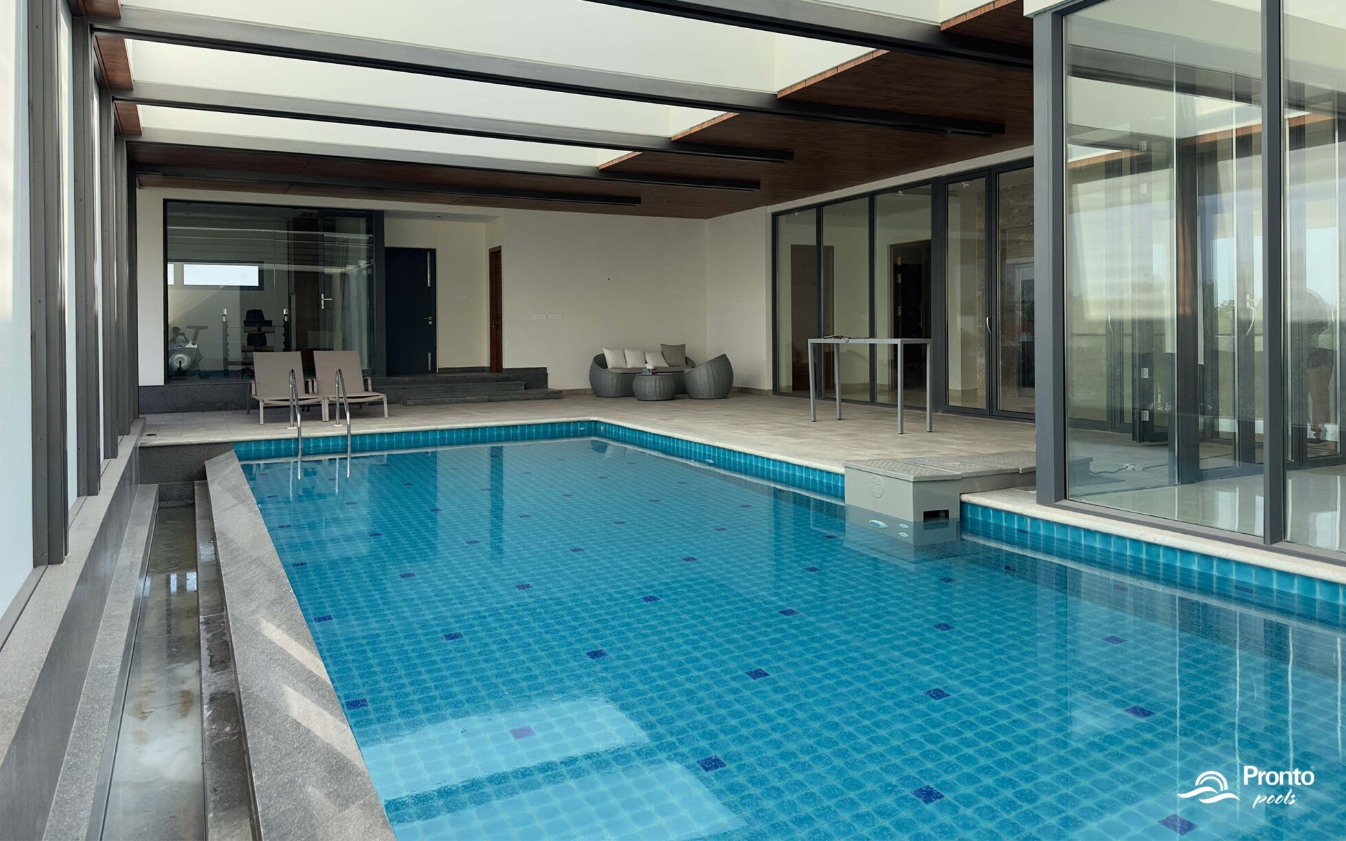 The pool is equipped with Pronto Pools’ signature pipeless filtration system, ensuring superior water quality, easy maintenance, and a sleek design that eliminates the need for a traditional plant room. Its elevated position on the first floor not only enhances the aesthetics of the residence but also provides a unique leisure experience for the family.